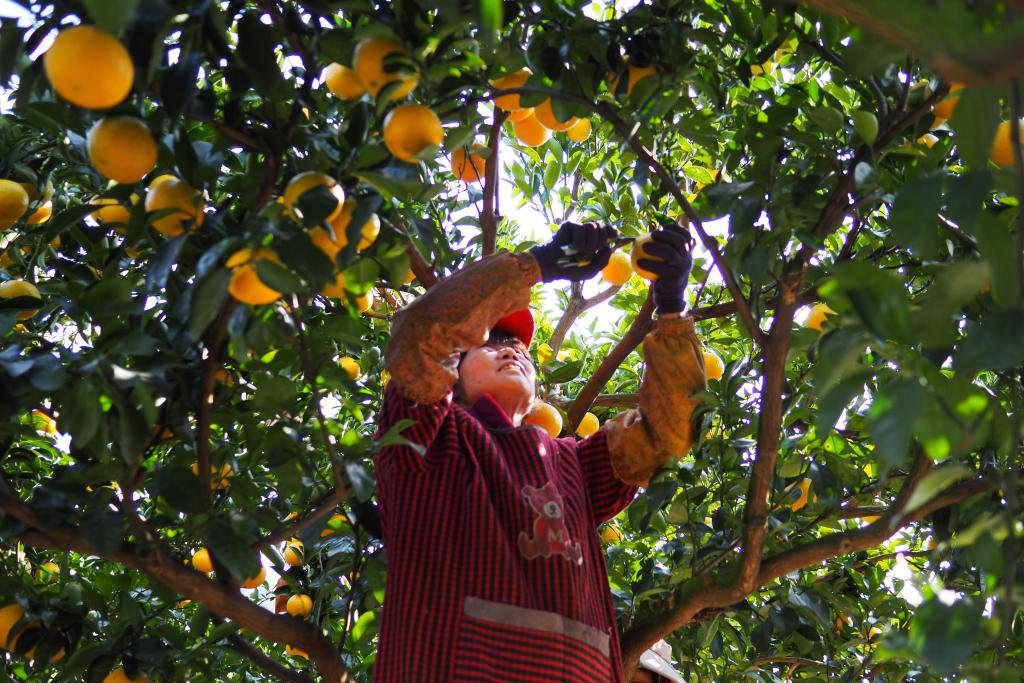 12月11日,在浙江省庆元县竹口镇黄坛水干果园区内,工人在采摘甜桔柚。新华社记者 刘梓漪 摄