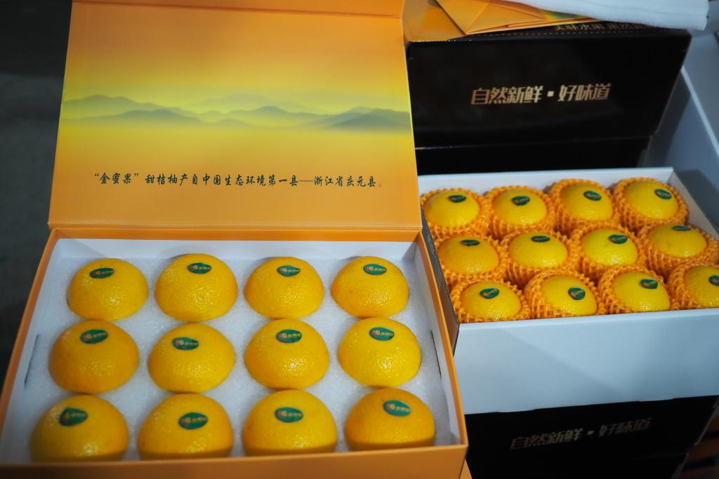 这是12月11日在浙江省庆元县竹口镇黄坛水干果园区内拍摄的分装好的甜桔柚礼盒。新华社记者 刘梓漪 摄