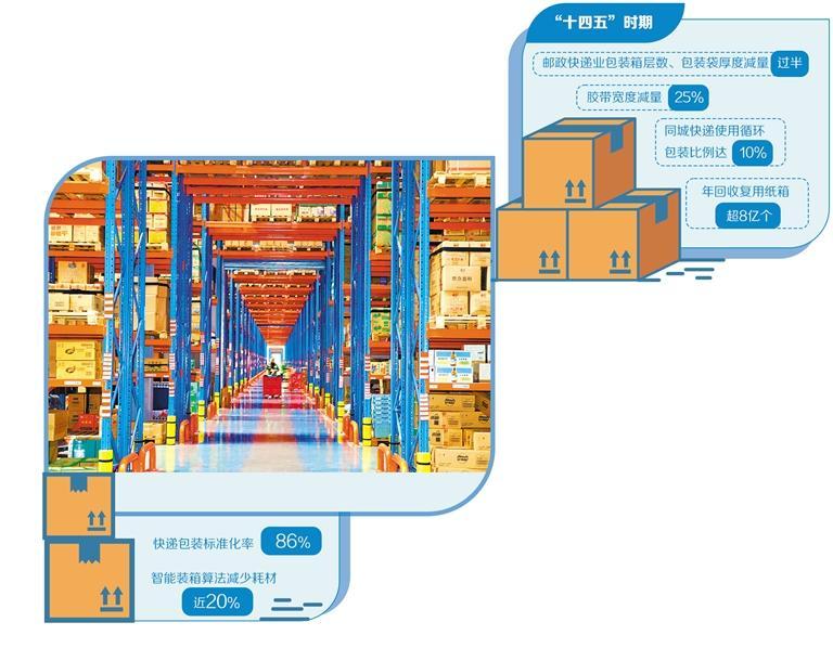 国家邮政局近日发布数据显示,“十四五”时期,全行业电子运单、循环中转袋基本实现全覆盖,包装箱层数、包装袋厚度减量过半,胶带宽度减量25%,同城快递使用循环包装比例达10%,年回收复用纸箱超8亿个。