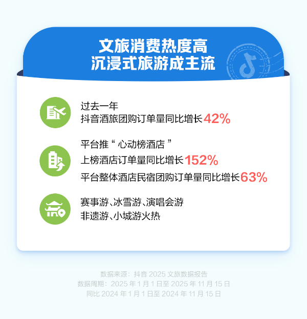 2025年岁末,抖音生活服务发布的《2025文旅数据报告》呈现了一幅中国文旅消费活力蓬勃的年度图景。过去一年,平台文旅消费显著增长,酒旅团购订单量同比增长42%,酒店民宿订单量同比增长63%。尤为突出的是,基于抖音平台真实用户评价体系评选出的“心动榜酒店”,订单量同比暴增152%。