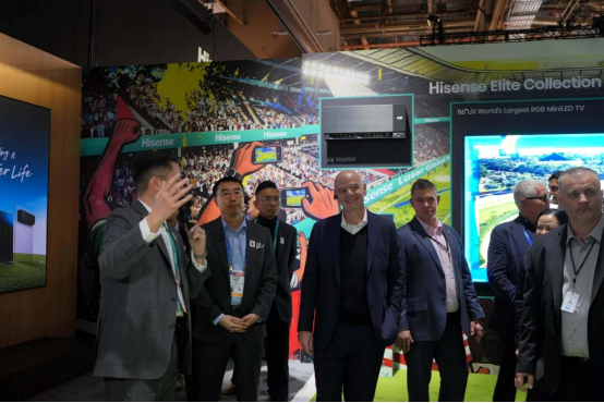 在海信展区,最新发布的全新一代RGB-Mini LED电视UX将赛场“搬”进客厅,草坪的纹理、球衣的色彩、光影的流动皆被细腻还原,以其震撼的画质效果实力圈粉。因凡蒂诺带队的访问代表团一行近距离体验了RGB-Mini LED电视UX等多款产品。