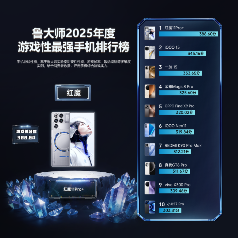 红魔 11Pro+荣登“2025年度性能最强手机”。它用2067258的惊人跑分证明:极致性能不仅能冲榜,更能稳定落地。“风冷+水冷”散热系统让性能释放不再短跑式爆发,而是更持久、更稳态的高帧输出,树立电竞旗舰的硬核标准。