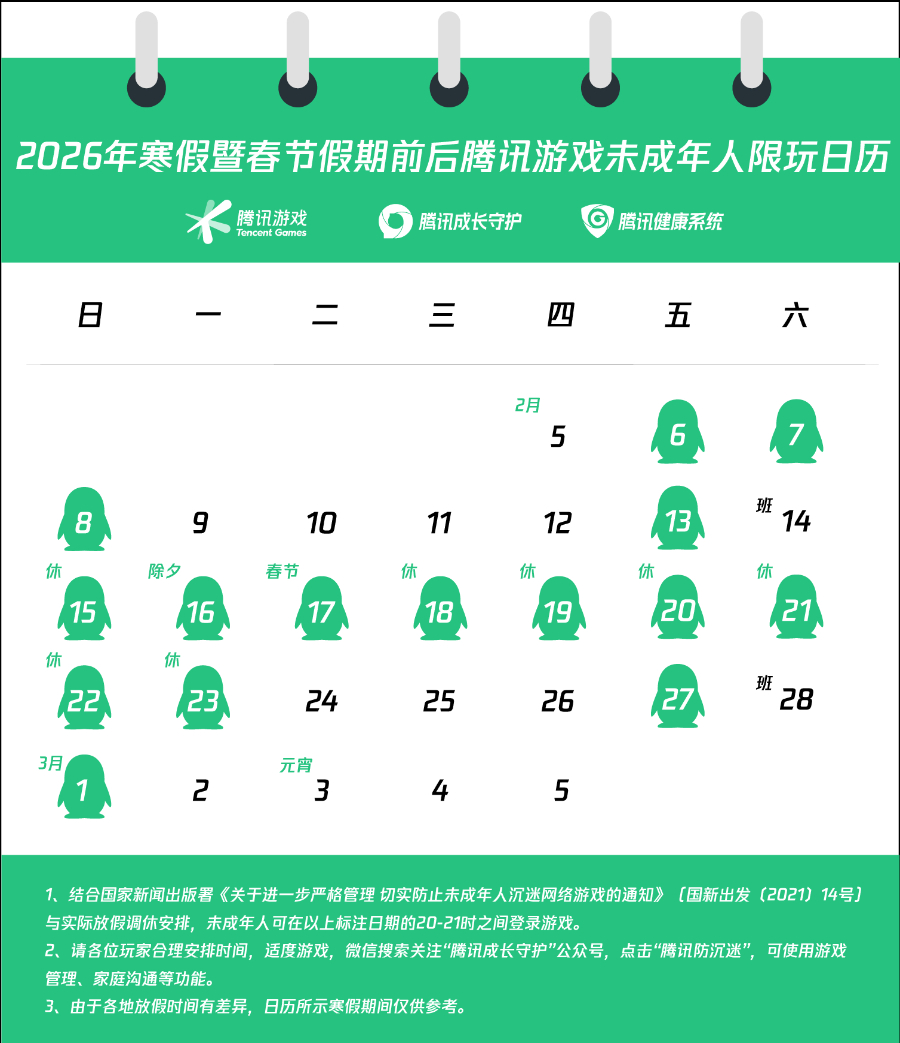 2月5日,腾讯游戏发布2026年寒假暨春节假期前后未成年人游戏限玩通知,根据相关规定,寒假29天内,未成年人可玩游戏时间共计15小时。同时,针对寒假期间未成年人用网时长增加、家庭共号场景高发等潜在问题,腾讯游戏宣布正式启动“2026年寒假未成年人保护专项行动”。