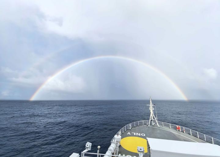 科考队员在接受记者连线时特别提示说:“专供新华社的‘深海一号’西太平洋科考现场拜年视频,背景里有彩虹,见者好运!”