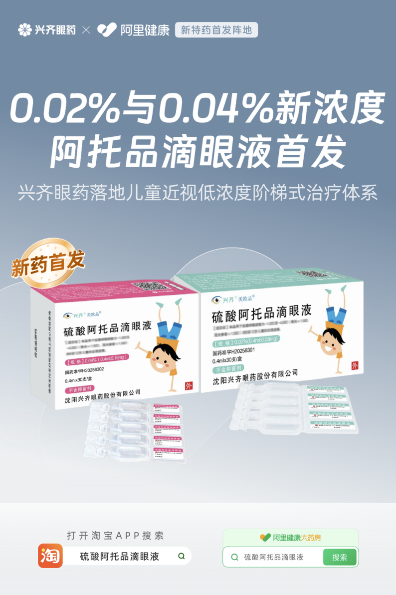 2月24日,沈阳兴齐眼药自主研发的0.02%与0.04%浓度硫酸阿托品滴眼液正式在阿里健康首发。该产品适用于6至12岁、球镜度数为-1.00D至-4.00D(散光≤1.50D、屈光参差≤1.50D)的儿童,用于延缓近视进展。至此,兴齐眼药已形成0.01%、0.02%和0.04%三档浓度梯度,构建起国内用于儿童近视管理的低浓度阿托品阶梯式治疗体系,标志着我国儿童青少年近视药物干预迈入“因人施治、精准防控”的新阶段。