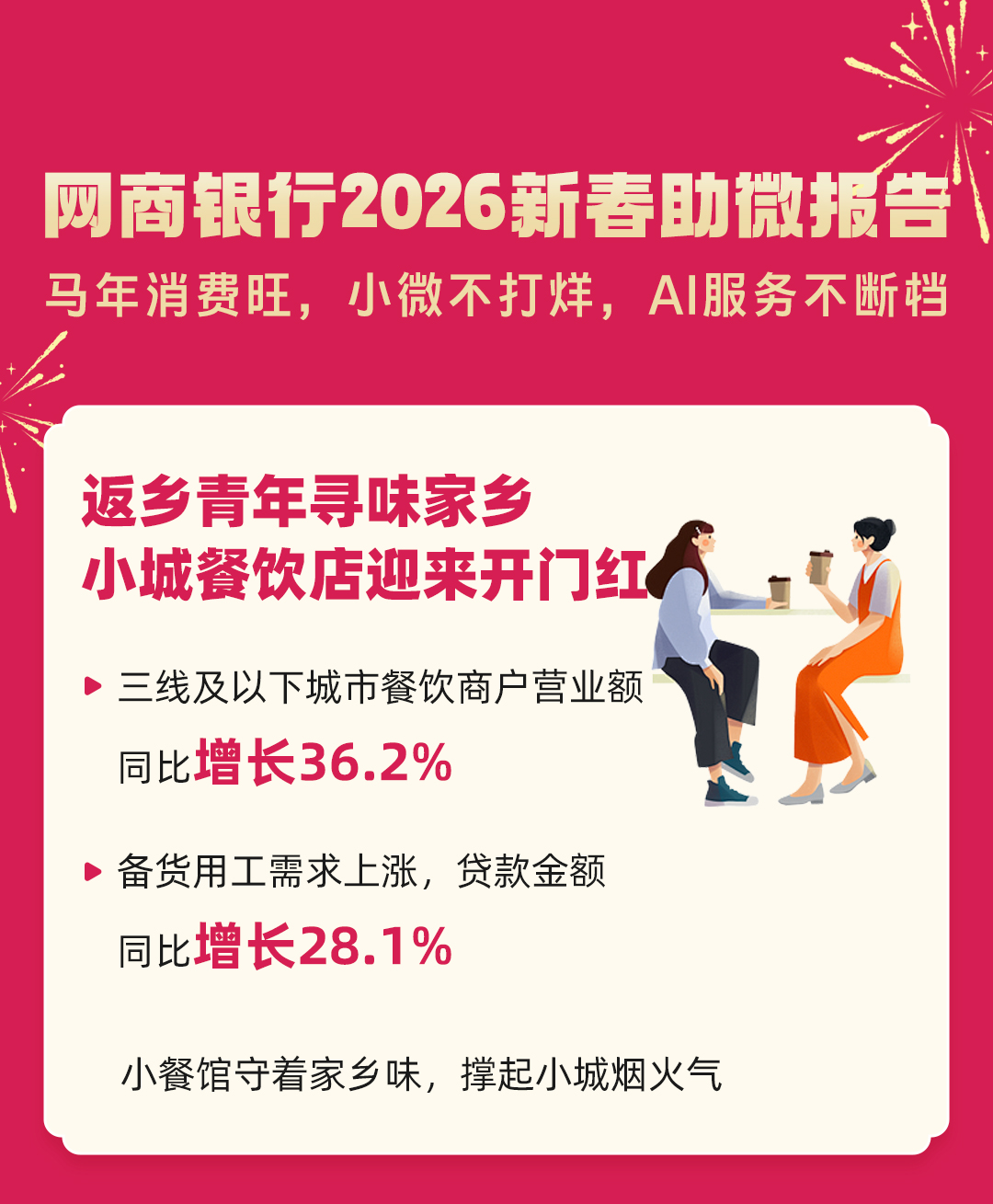 返乡潮激活小城消费活力,餐饮行业率先迎来开门红。网商银行数据显示,受返乡客流带动,三线及以下城市餐饮消费持续火爆,相关商户营业额同比增长36.2%;同时,客流回归带动备货、用工等需求同步攀升,商户经营性贷款金额同比增长28.1%。一碗家乡热汤,既撑起了浓浓年味,更彰显小城经济的强劲韧性。