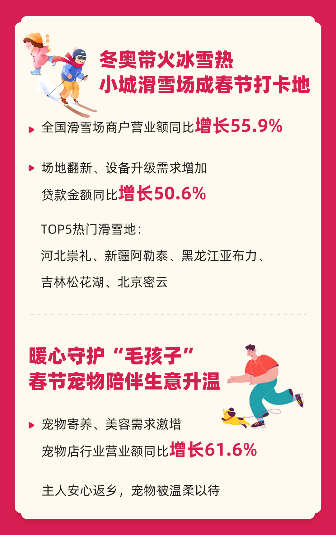 刚落幕的米兰冬奥会,点燃了全国冰雪旅游热。全国滑雪场商户营业额同比增长55.9%,贷款金额也同比增长50.6%,小城滑雪场更成为新春热门打卡地,河北崇礼、新疆阿勒泰、黑龙江亚布力、吉林松花湖、北京密云跻身TOP5热门滑雪地。