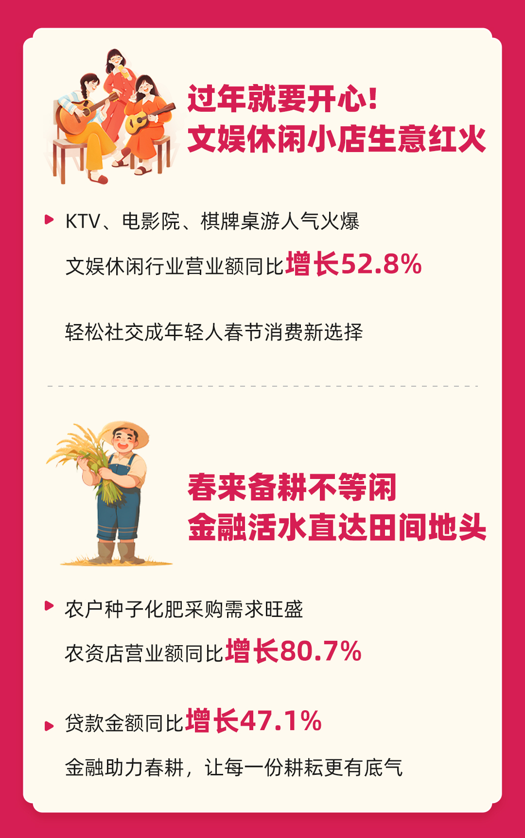 依托线下消费回暖势头,文娱休闲需求集中爆发。KTV、电影院、棋牌桌游等文娱休闲行业营业额同比增长52.8%,年轻人们正从线上走向线下,约上三五好友聚会、休闲、放松,正成为春节消费新选择。