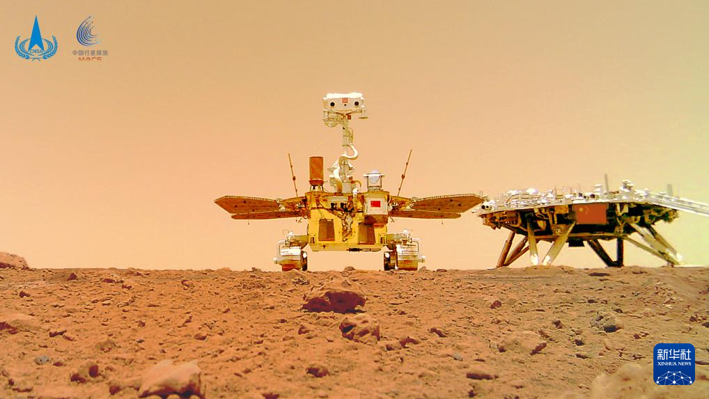 2021年6月11日,国家航天局在北京举行天问一号探测器着陆火星首批科学影像图揭幕仪式,公布了由祝融号火星车拍摄的着陆点全景、火星地形地貌、“中国印迹”和“着巡合影”等影像图。这是“着巡合影”图。