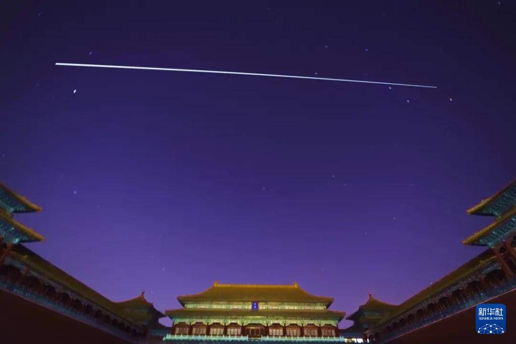 2021年11月19日,在北京故宫午门拍摄的中国空间站过境照片(轨迹为多张照片堆栈)。