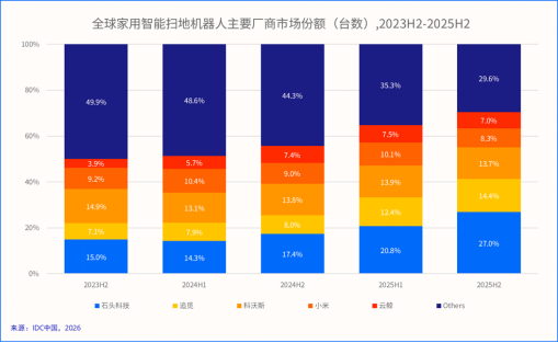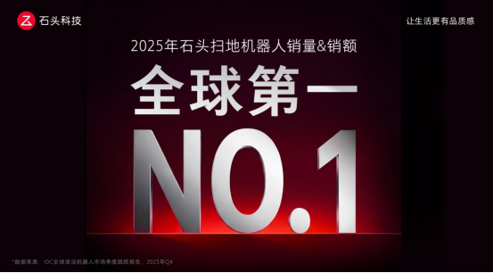 3月9日,国际数据公司(IDC)发布最新的《全球家用智能清扫机器人市场跟踪报告》。报告显示,2025年全球家用清洁机器人市场出货量达3272万台,同比增长20.1%,扫地机器人在2025年稳步增长,出货2412.4万台,增长17.1%。值得关注的是,2025年,石头科技以17.7%的份额领跑全球清洁机器人市场,其智能扫地机器人的全球市场份额达到27.0%,连续两年获得扫地机器人全球销量与销额“双第一”。