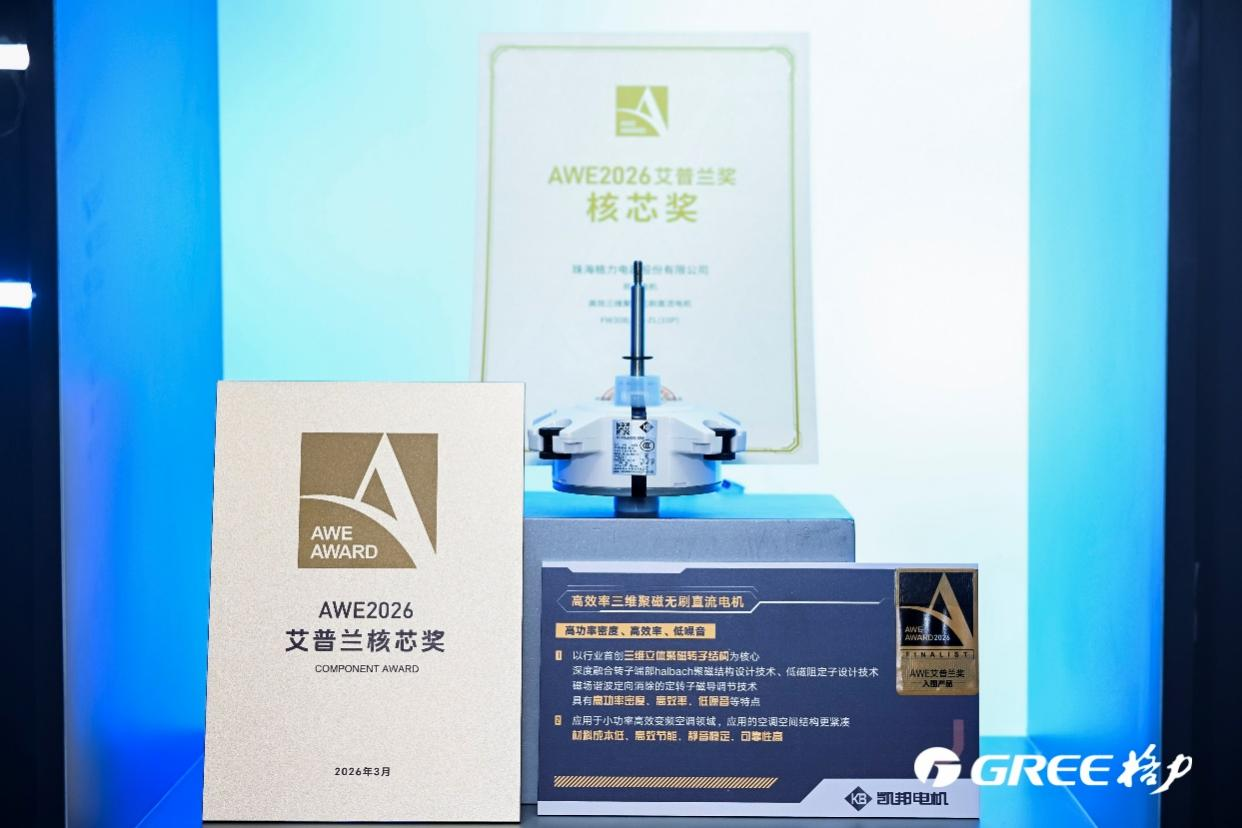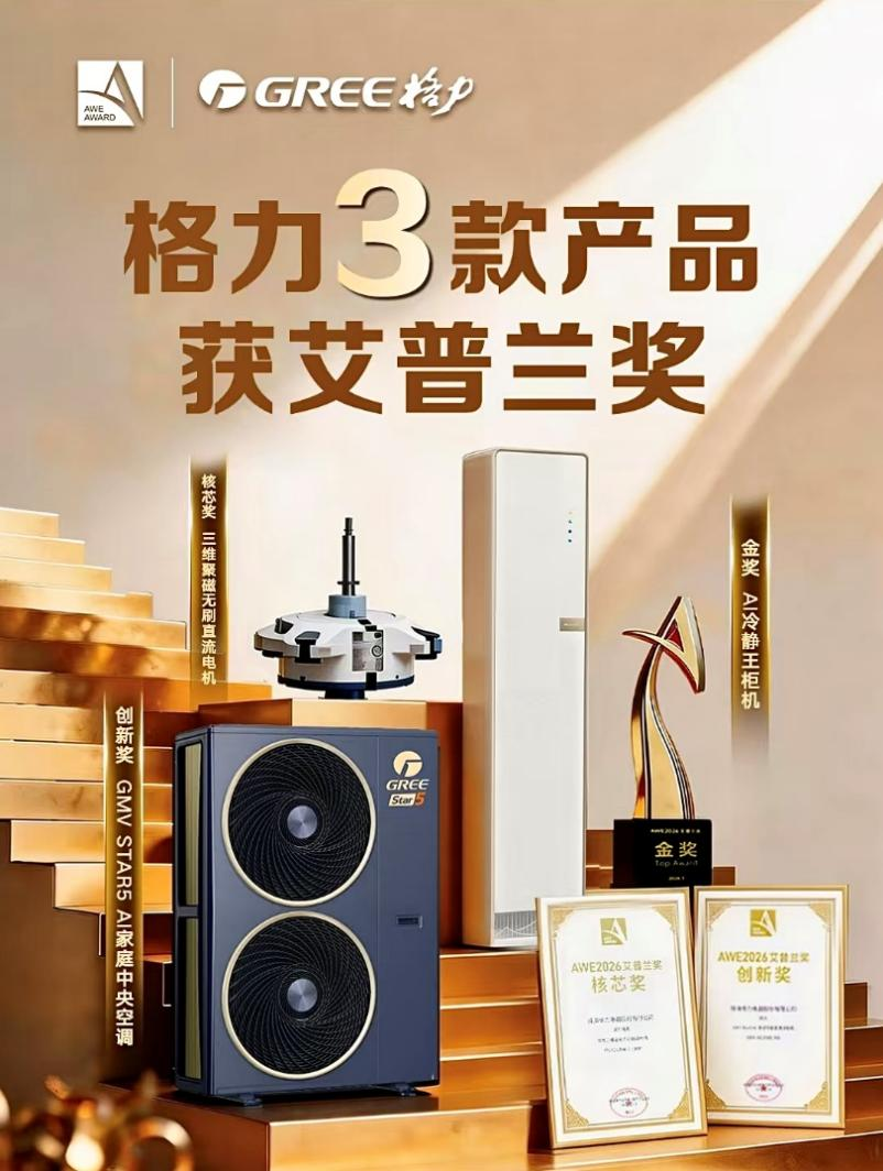近日,2026年中国家电及消费电子博览会(AWE2026)在上海开幕,艾普兰奖获奖名单正式揭晓。格力电器凭借对用户需求的深刻洞察与核心技术突破,Ai冷静王柜机荣获“金奖”,三维聚磁无刷直流电机荣获“核芯奖”,GMV Star5 AI家庭中央空调荣获“创新奖”。