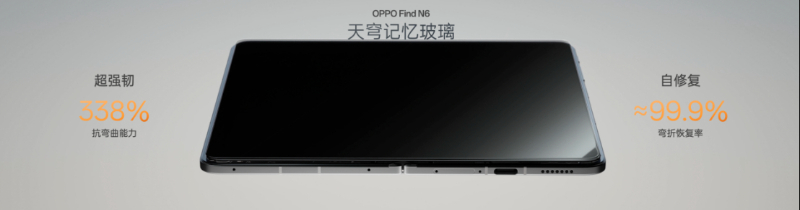 与天穹铰链形成完美协同的是OPPO全新研发的“天穹记忆玻璃”。针对传统柔性玻璃反复弯折后不可逆的形变难题,天穹记忆玻璃采用超坚固新型基材,至高可承受5公斤重压。通过深度化学强化工艺,让抗弯曲形变能力提升至传统柔性玻璃的338%,弯折后可实现99.9%的形状自修复,如同记忆枕一般,展开后折痕可快速回弹淡化,成为屏幕久用平整的核心保障。