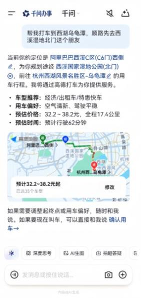 在途经点选择上,用户可以通过自然语言灵活调整。行程开始前,说“帮我打车到西湖乌龟潭,顺路先去西溪湿地北门送个朋友”,千问可自动添加途经点。同时也支持在行程开始后,一句话添加途经点。