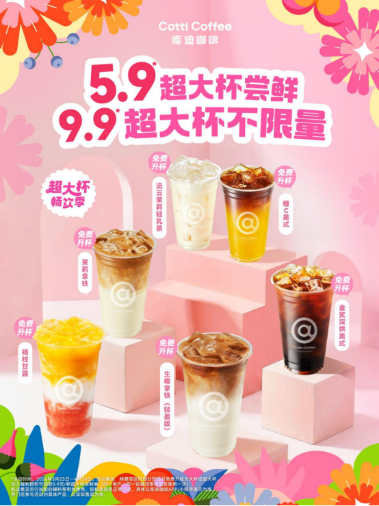 3月23日,库迪咖啡宣布在全国范围开启春季“超大杯畅饮季”主题活动,爆款饮品超大杯9.9元不限量畅饮。活动专区包含生椰拿铁轻盈版、杨枝甘露、金奖美式、茉莉拿铁、橙C美式、流云茉莉等核心爆款产品,所有饮品均支持免费升级大杯及超大杯规格,购买不限量、不限频次、不限时段,与此同时,消费者还能领取5.9元超大杯尝鲜券。