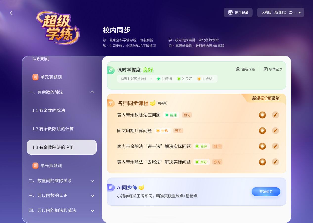 与传统的学习机不同,T6学习机将“学练一体”的理念融入产品设计的每个细节,打造“超级学练”的专属沉浸感。孩子通过“超级学练”入口,进入完整的“诊-学-练-测”学习闭环,这是T6最具辨识度的交互创新。系统会自动规划每节课从诊断到学习、从练习到测试的完整学习路径,孩子无需自己决策“该学什么”“该练什么”,只需沉浸在学习本身。而“一课一练”微循环机制,确保每节课程结束后,系统会自动推送针对性练习,既不会打断学习节奏,又能及时巩固刚学的内容。