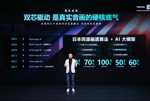 历经二十年迭代,东芝画质处理单元从REGZA Engine ZR奠基,演进至ZRα架构,实现光色同控算法;音频处理单元从BR引擎问世,升级至BRα架构,整合8声道独立驱动、Eilex音效算法及AI音效自适应算法。双芯协同,构成了东芝“真实音画”不可复制的技术底座。