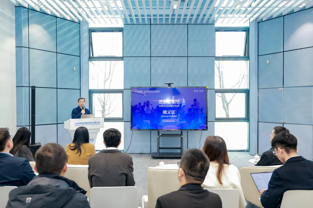 3月26日上午,2026中关村论坛年会中关村国际技术交易大会“区长会客厅”顺义区专场在中关村国际技术交易中心成功举办。活动聚焦顺义区重点产业布局,搭建政企面对面沟通洽谈桥梁,顺义区副区长侯颖,区政协副主席、科学技术委员会主任杨凤辉等出席活动,与创新项目代表共话发展机遇。