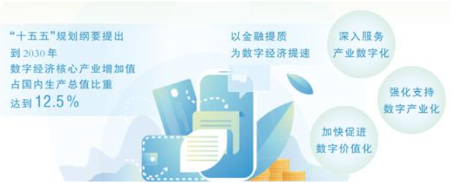 “十五五”规划纲要提出,到2030年,数字经济核心产业增加值占国内生产总值比重达到12.5%。从2024年占比10.5%到2030年的12.5%,金融理应更加深入数字经济各领域各环节,以自身服务提质为数字经济发展提速。