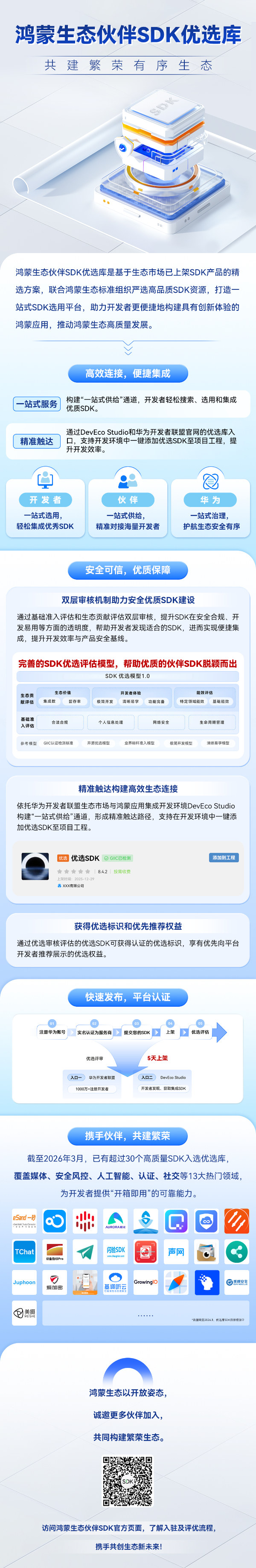 鸿蒙生态伙伴SDK优选库自去年推出以来,历经了一年的深度打磨与沉淀,已成为具备成熟度、专业性与便捷性的资源汇聚平台。依托华为开发者联盟生态市场与鸿蒙应用集成开发环境DevEco Studio,联合鸿蒙生态标准组织严选高品质SDK资源,SDK优选库将分散的优质能力优选汇聚,让开发者可以一站式选用,更高效、更安全地构建创新体验丰富的鸿蒙应用。