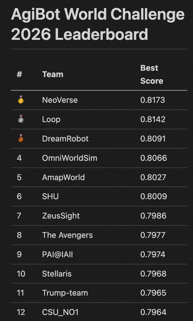 近日,在Agibot World Challenge与World Arena两大国际权威评测中,中国Abot-world系列世界模型实现了双双登顶。这标志着中国在具身智能核心基础能力——世界模型构建方面已经处于全球领先水平。