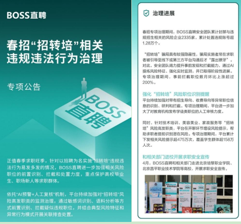 BOSS直聘相关负责人表示,针对“招转培”等风险,平台将持续升级治理技术和风险识别能力,对招聘违规行为保持高压治理态势,同时继续加强与社会多方力量的协同联动,共同维护更加规范、有序、安全的求职招聘环境。