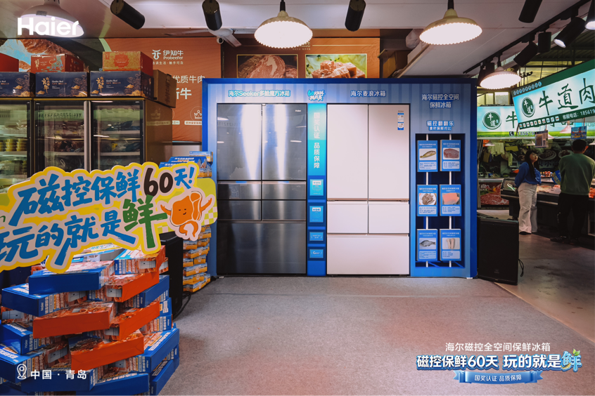 4月28日起,海尔磁控全空间保鲜冰箱在青岛埠西海鲜市场举行“磁控保鲜60天,玩的就是鲜”大型线下实证活动。海尔智家制冷产业国内市场大营销总监张涛、海尔智家青岛中心营销总监李渊、青岛制冷产业总监刘煜炜、埠西海鲜农贸市场总经理袁德勇出席活动。活动现场,海尔新品Seeker冰箱与麦浪9系冰箱携磁控保鲜技术,向消费者发起一场公开、透明、可验证的“保鲜对比挑战”。一块牛肉,一盘海虾、一条鱼、两台冰箱——新鲜度究竟能不能跑赢时间?答案,将在5月8日揭晓。