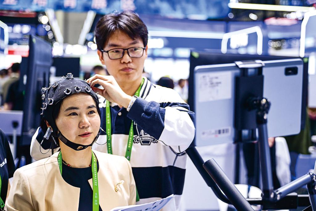 “我们是带着能解决产业痛点的技术来找合作的。”在未来产业展区,上海脑虎科技有限公司工作人员潘伊琪指着一款脑机接口设备介绍说,这款设备可实现瘫痪患者“意念控制”假肢,此次参展不到半天,就有十多家企业和机构表达了合作意向。