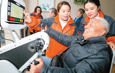 在重庆万盛经区万盛街道安博馨社区“智慧养老”服务站,服务人员教老人使用智能健身器材。曹永龙摄(人民图片)