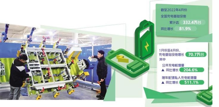 充电联盟最新发布的报告显示,截至2022年4月份,全国充电基础设施累计数量为332.4万台,同比增长81.9%。1月份至4月份,充电基础设施增量为70.7万台,其中公共充电桩增量同比增长204.6%,随车配建私人充电桩增量同比增长511.1%。