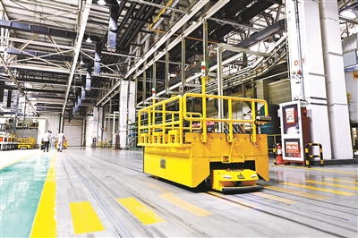 北京福田康明斯发动机有限公司厂房内,“AGV小车”可完成自动配送