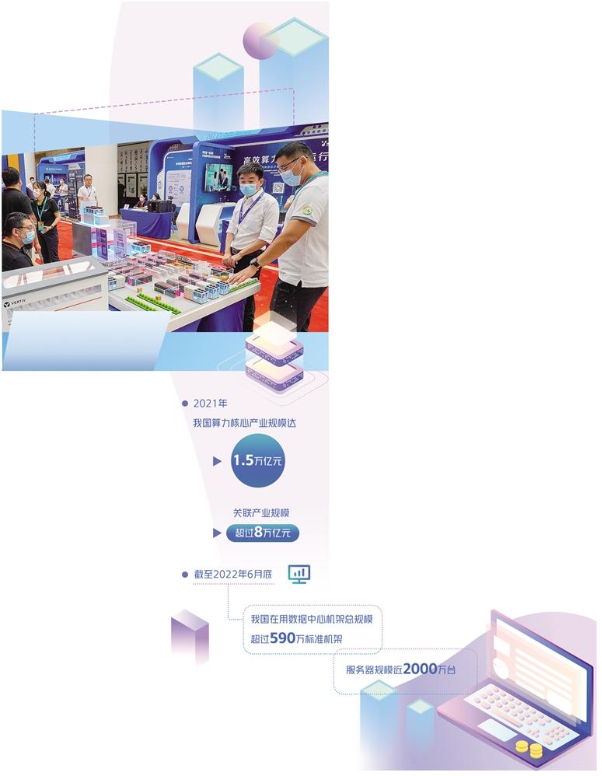 记者从近日举行的2022中国算力大会上获悉,截至今年6月底,我国在用数据中心机架总规模超过590万标准机架,服务器规模近2000万台,算力总规模超过150 EFLOPS(每秒15000京次浮点运算次数),位于全球第二位。2021年,我国算力核心产业规模达1.5万亿元,关联产业规模超过8万亿元;我国数据中心存储总容量达800EB(1EB=1024PB),全国先进存储使用占比约14%,对数据存储性能要求较高的一线城市先进存储占比最高达17%。
