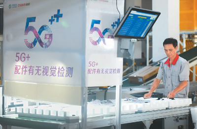 德意电器员工在位于浙江省杭州市萧山经济开发区的生产车间利用5G技术对新款油烟机配件进行视觉检测。龙 巍摄(人民图片)