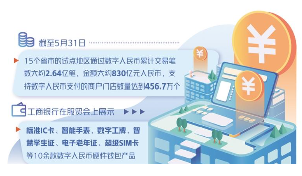 产品创新提速、使用场景拓宽,数字人民币试点正稳步推进。截至5月31日,15个省市的试点地区通过数字人民币累计交易笔数大约2.64亿笔,金额大约830亿元人民币,支持数字人民币支付的商户门店数量达到456.7万个。