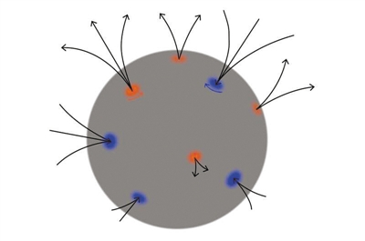 拥有多个漩涡的黑洞(示意图),彩色表示漩涡方向,黑色代表磁力线。图片来源:物理学家组织网