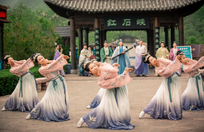 “风吹仙袂飘摇举,犹似霓裳羽衣舞……”在云台山丹崖碧水的红石峡景点内,丽人行的姑娘仿佛从画中翩然而来,她们或轻摇团扇,或浣花弄茶,或吟歌起舞,与丹崖碧水的峡谷,碧如翡翠的湖水,朦胧袅袅的云雾融为一体,构成一幅流动的东方古典山水写意画,还有诗佛王维、神仙眷侣等人物吸引众多游客打卡拍照。