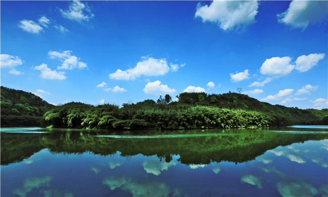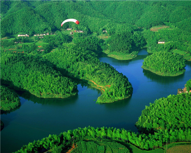 蜀南竹海青龙湖位于高耸险峻的插旗山下,水面3平方公里,是葱茏竹海之中的最大湖泊。湖身呈龙状,头大尾小,故名青龙湖。