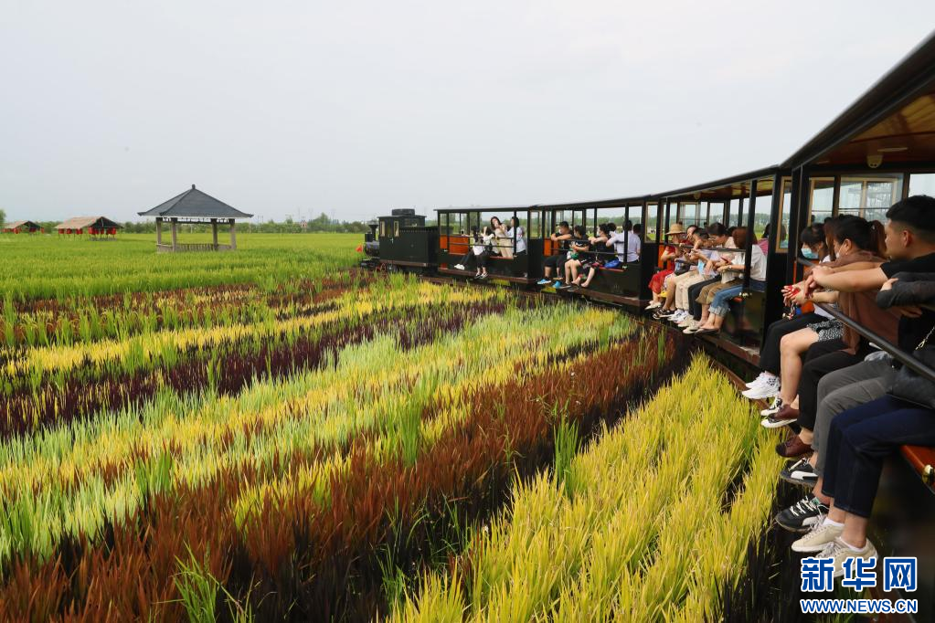 8月16日,游客乘坐小火车在稻田中观光游览。 近日,辽宁省沈阳市沈北新区锡伯龙地创意农业产业园的稻田画进入观赏期,多种色彩的水稻组成稻田画,吸引众多游人前来观光体验。 新华社记者 杨青 摄pagebreak
