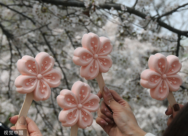 游客合影玉渊潭网红樱花冰淇淋与樱花