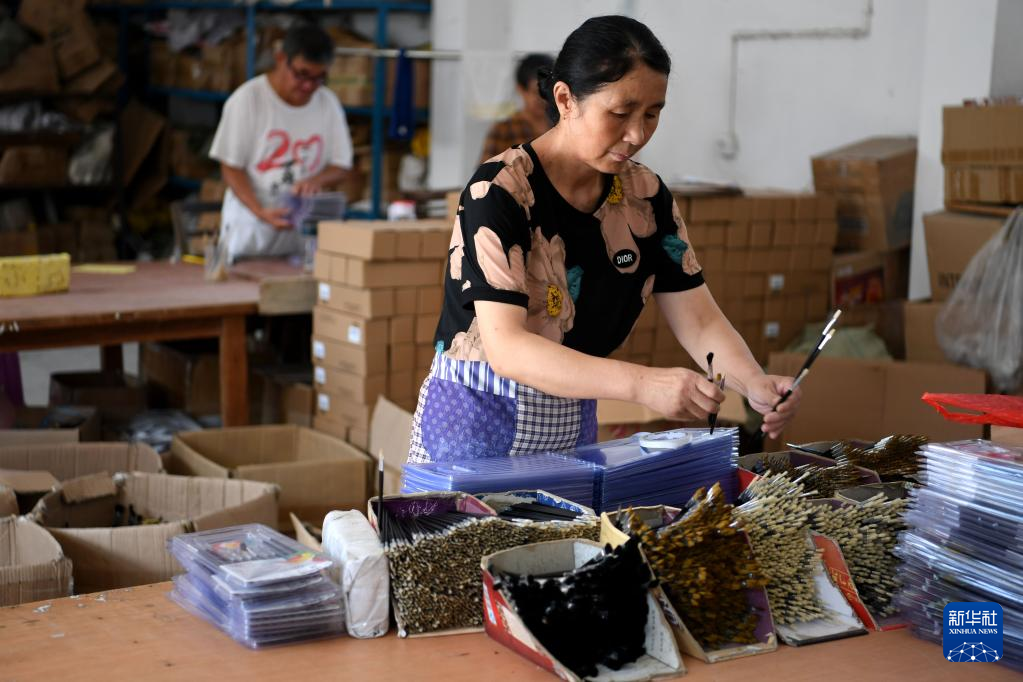 8月25日,在泾县榔桥镇一家油画笔企业,工人在包装油画笔。 近年来,安徽省宣城市泾县榔桥镇发挥油画笔产业优势,多举措助力油画笔产业发展。目前,榔桥镇拥有油画笔加工企业20多家,年产值超过2亿元,带动1000余人实现就业,助力乡村振兴。 新华社记者 刘军喜 摄pagebreak
