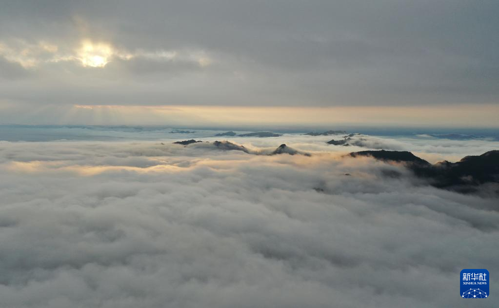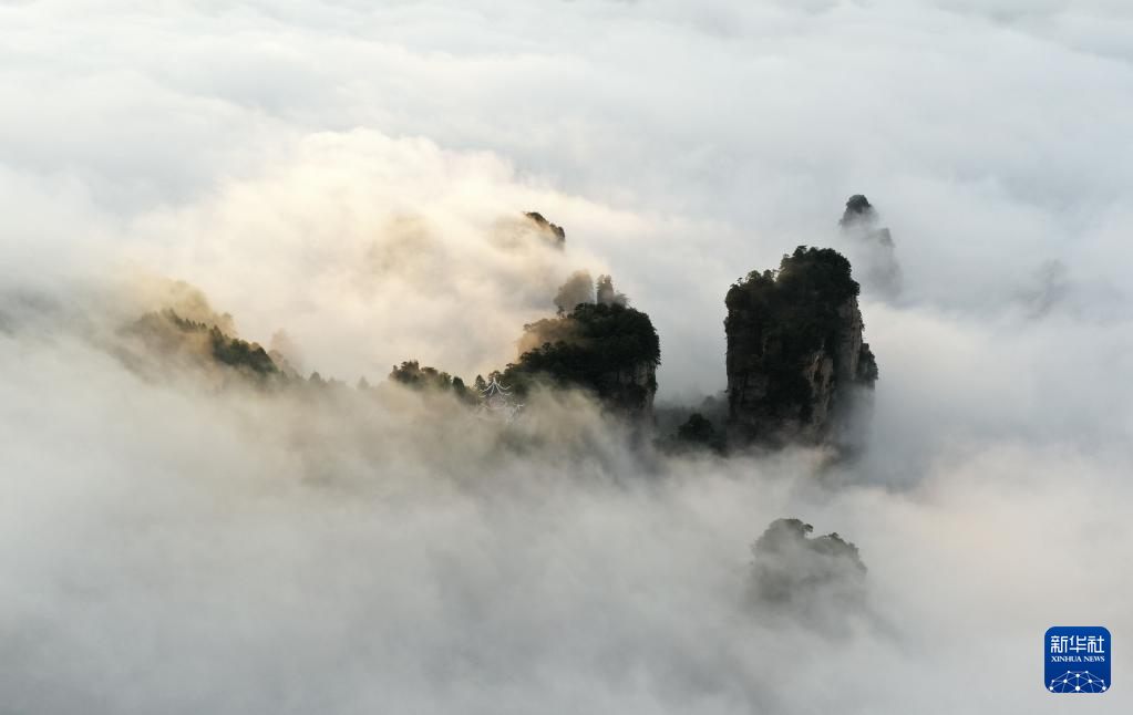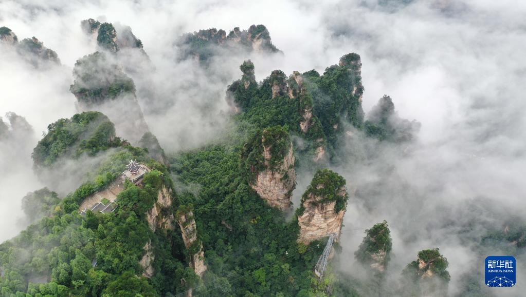 这是8月28日在张家界武陵源景区黄石寨拍摄的云海景观(无人机照片)。 当日,连续降雨后的湖南省张家界武陵源景区黄石寨出现壮美的云海景观,峰林间云雾缥缈,宛如水墨仙境。 新华社发(吴勇兵 摄)