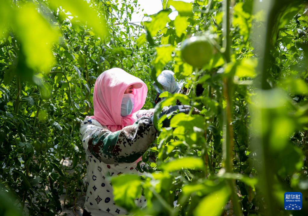 8月29日,在宁夏银川市贺兰县洪广镇欣荣村果蔬种植园区,农民在番茄大棚内工作。 宁夏银川市贺兰县洪广镇欣荣村是一个“十二五”生态移民搬迁安置村,近年来,欣荣村依托区位优势发展香菇、番茄、红树莓、葡萄等特色设施果蔬产业,助力农民增收致富。目前,欣荣村有180余栋大中拱棚,并建设了配套冷库,设施果蔬产业为150余名群众提供了稳定的就业岗位。 新华社记者 杨植森 摄pagebreak