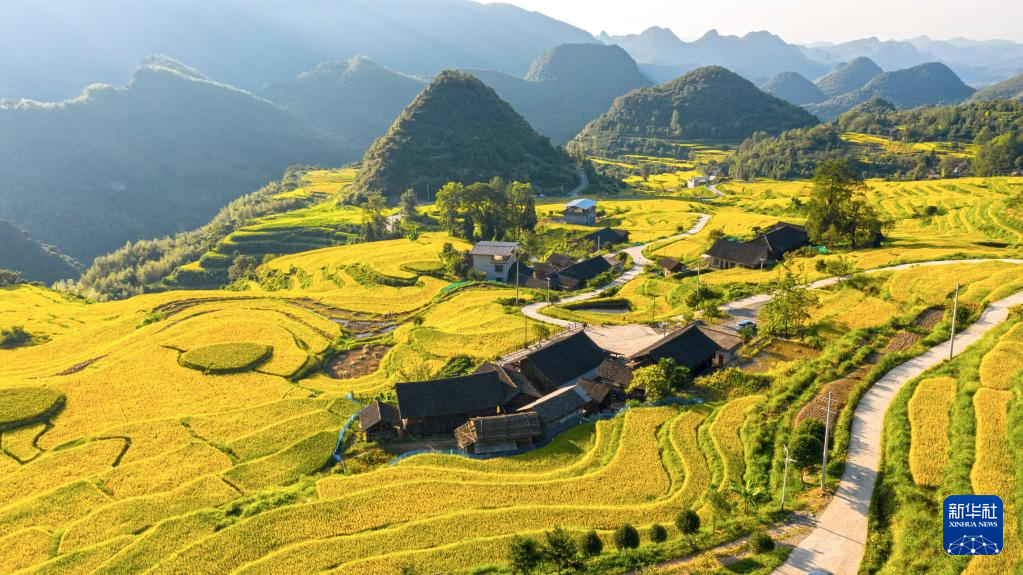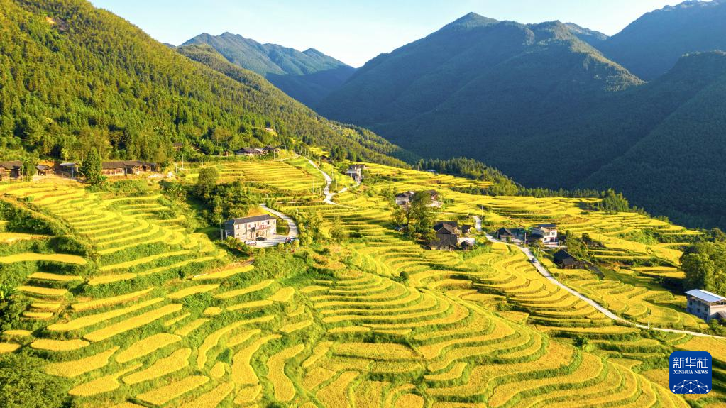 9月5日拍摄的东安县塘家村梯田(无人机照片)。 眼下,湖南省东安县山村梯田丰收在望,金黄色的梯田层层叠叠,美不胜收。 新华社发(严洁 摄)