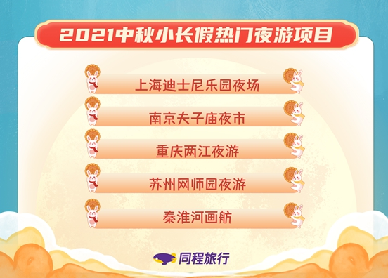 《2021中秋小长假旅游趋势报告》显示,中秋小长假期间国内各大目的地、景区的夜游关注度均出现增长趋势,主题公园夜场、江河夜游、城市夜景观光等适宜赏月的夜间旅游项目更受青睐。上海迪士尼乐园夜场、南京夫子庙夜市、重庆两江夜游、苏州网师园夜游和秦淮河画舫是今年中秋小长假期间的热门夜游项目。