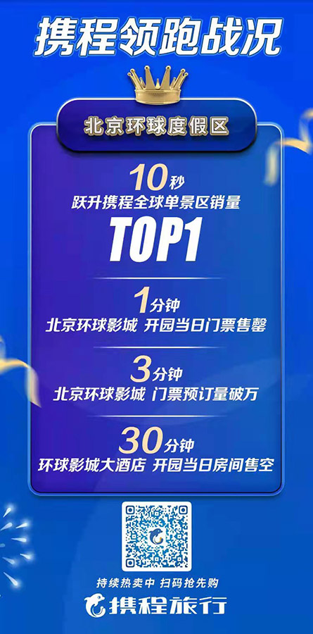 9月14日0时,环球影城门票正式开售。携程平台数据显示,环球影城开售10秒内,即跃升携程全球单景区销量TOP 1,1分钟内开园当日门票即售罄,3分钟内门票预订量破万,30分钟内,环球影城大酒店开园当日房间售空。得益于强大的技术实力,携程票务系统全程高效运转,稳定承压。