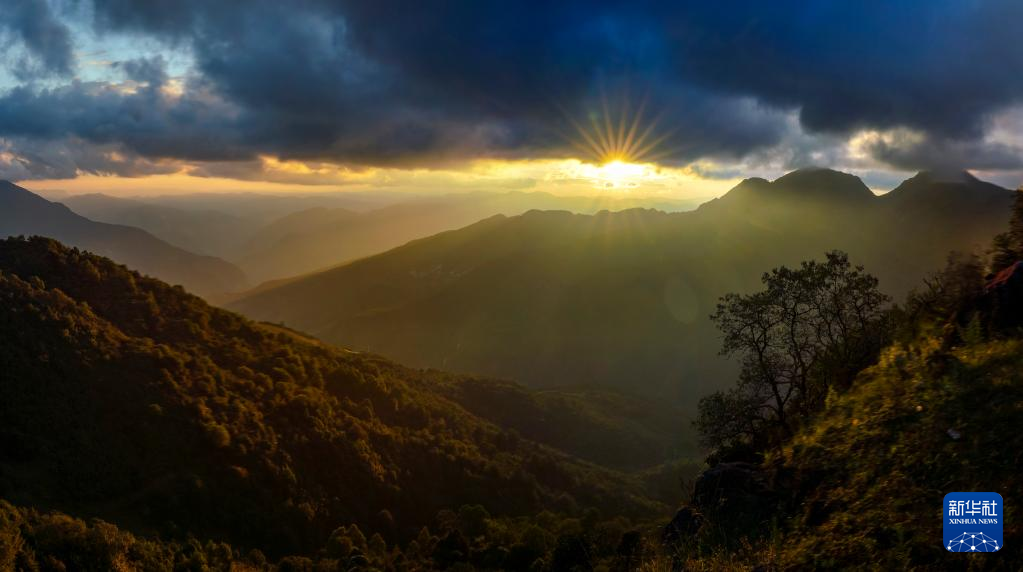 轿子山日落美景(9月22日摄)。 云南轿子山国家级自然保护区位于昆明市东川区与禄劝彝族苗族自治县的交界,是昆明地区的生态屏障。秋日的保护区内云雾缭绕,景色迷人。 新华社记者 江文耀 摄