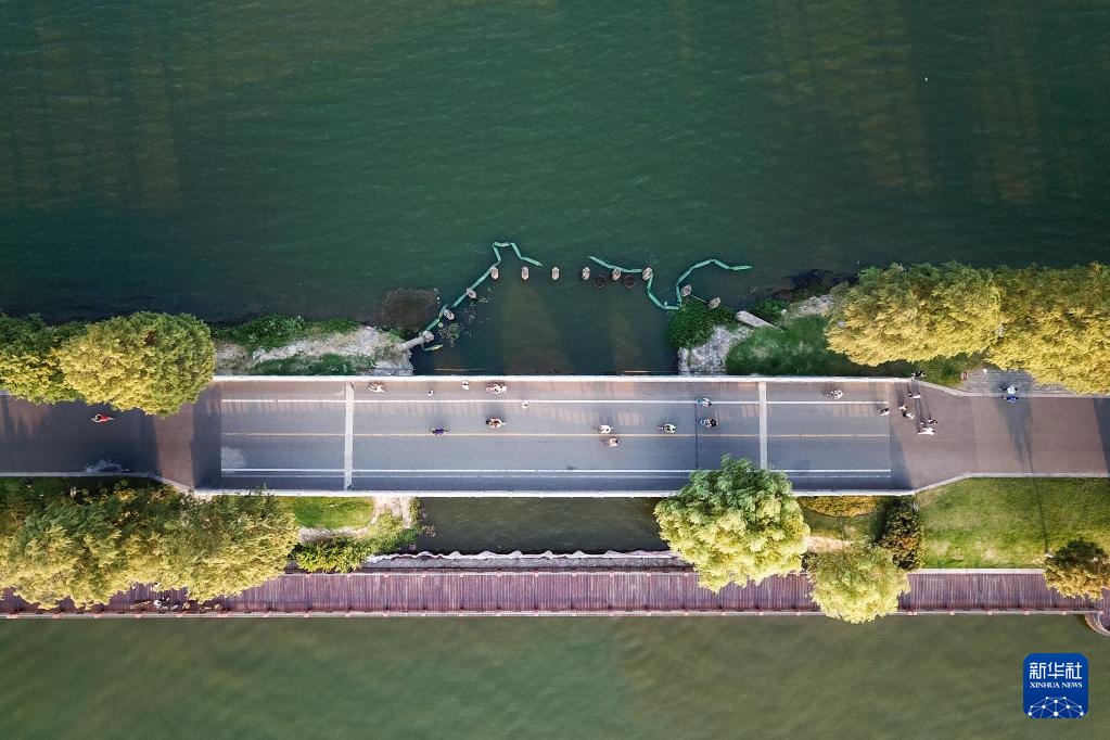10月4日,游客在武汉东湖绿道上骑行(无人机照片)。 国庆长假期间,不少市民、游客前往武汉各个景点游玩,欢度假期。 新华社发(伍志尊 摄)pagebreak