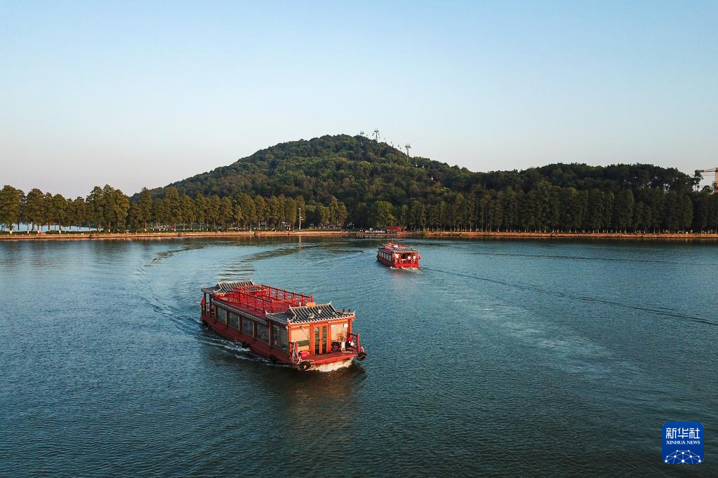 10月4日,游客在武汉市东湖景区乘坐湖景观光船(无人机照片)。 国庆长假期间,不少市民、游客前往武汉各个景点游玩,欢度假期。 新华社发(伍志尊 摄)pagebreak