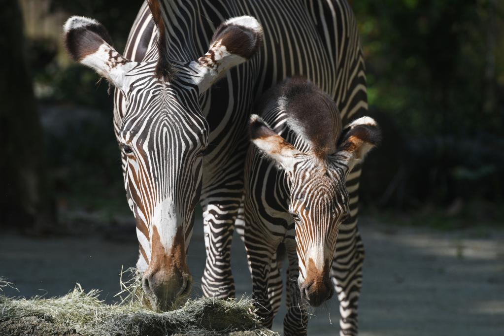 这是10月26日在新加坡动物园拍摄的新生细纹斑马与它的母亲。 这匹9月30日出生的细纹斑马当天在新加坡动物园首次亮相。 新华社发(邓智炜摄)pagebreak