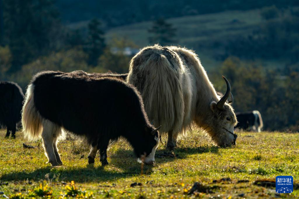 牦牛在普达措景区草场上觅食(10月25日摄)。 深秋时节,云南省迪庆藏族自治州普达措景区内层林尽染,景色宜人。 普达措景区位于滇西北“三江并流”世界自然遗产中心地带,拥有湖泊湿地、森林草甸、河谷溪流、珍稀动植物等丰富资源,是当地重要的生物多样性宝库和生态安全屏障。 新华社记者 江文耀 摄pagebreak